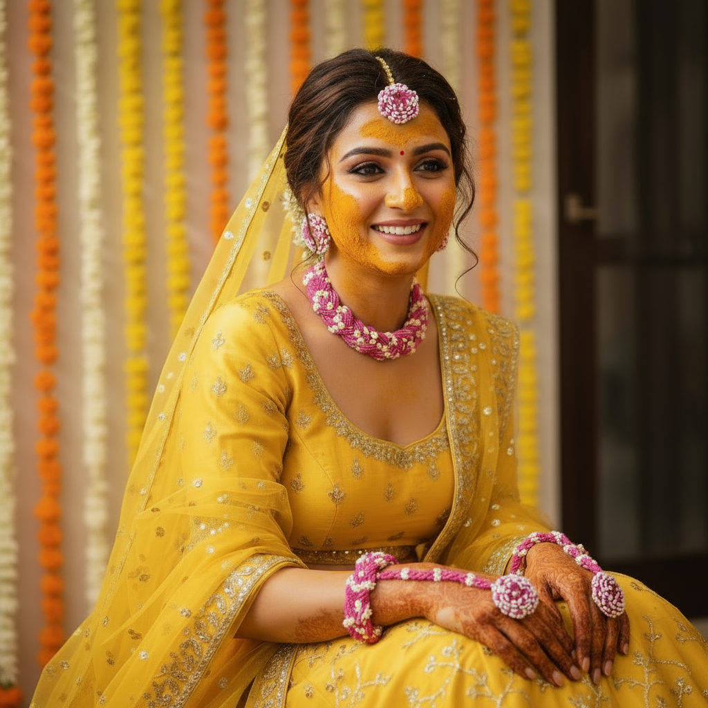 Bored with the usual floral and cowrie jewellery that is worn for haldi? Stand out with this set that you can not just wear for your haldi, but you can reuse it afterwards too.