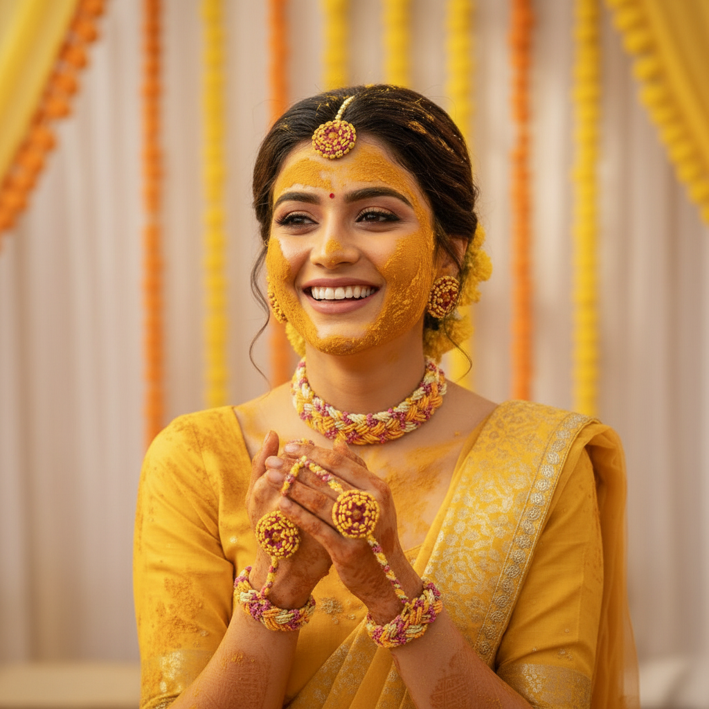 Bored with the usual floral and cowrie jewellery that is worn for haldi? Stand out with this set that you can not just wear for your haldi, but you can reuse it afterwards too.