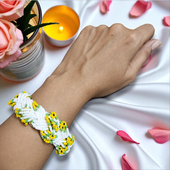 A beautifully handcrafted seed bead necklace, made by plaiting layers of bead chains made with white seed beads and yellow and green flowers. Comes with a matching set of earrings and bracelet. Perfect as a unique accessory for a party and will work with any outfit, be it a saree, a gown, or a kurti.
