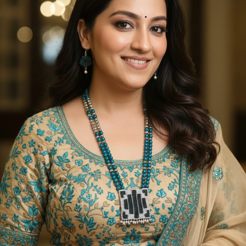 Created in teal and silver coloured yarn, this is a beautiful set that will liven up a simple outfit. The pendant is made using the Cavandoli technique in macrame and the bead chain has 2 layers with teal glass beads and silver faceted crystal beads. The earrings is a single coloured pattern with a single silver bead.