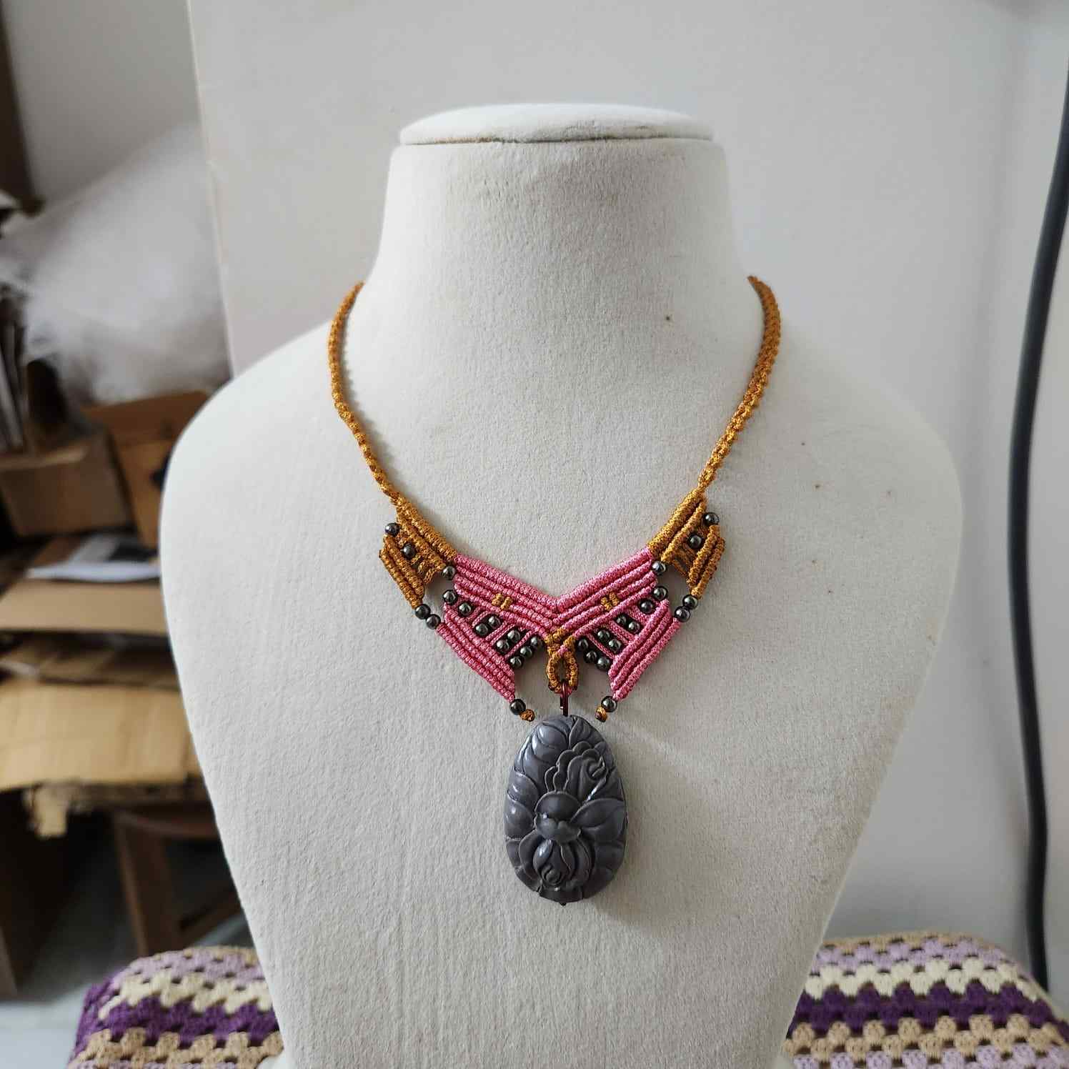 This lightweight bead macrame necklace has a large teardrop shaped sculpted grey ceramic bead which functions as a pendant. The colours used are rose pink and deep mustard. Small grey metalic beads are also used to accentuate and contrast with the pink of the necklace. A truly pretty necklace.