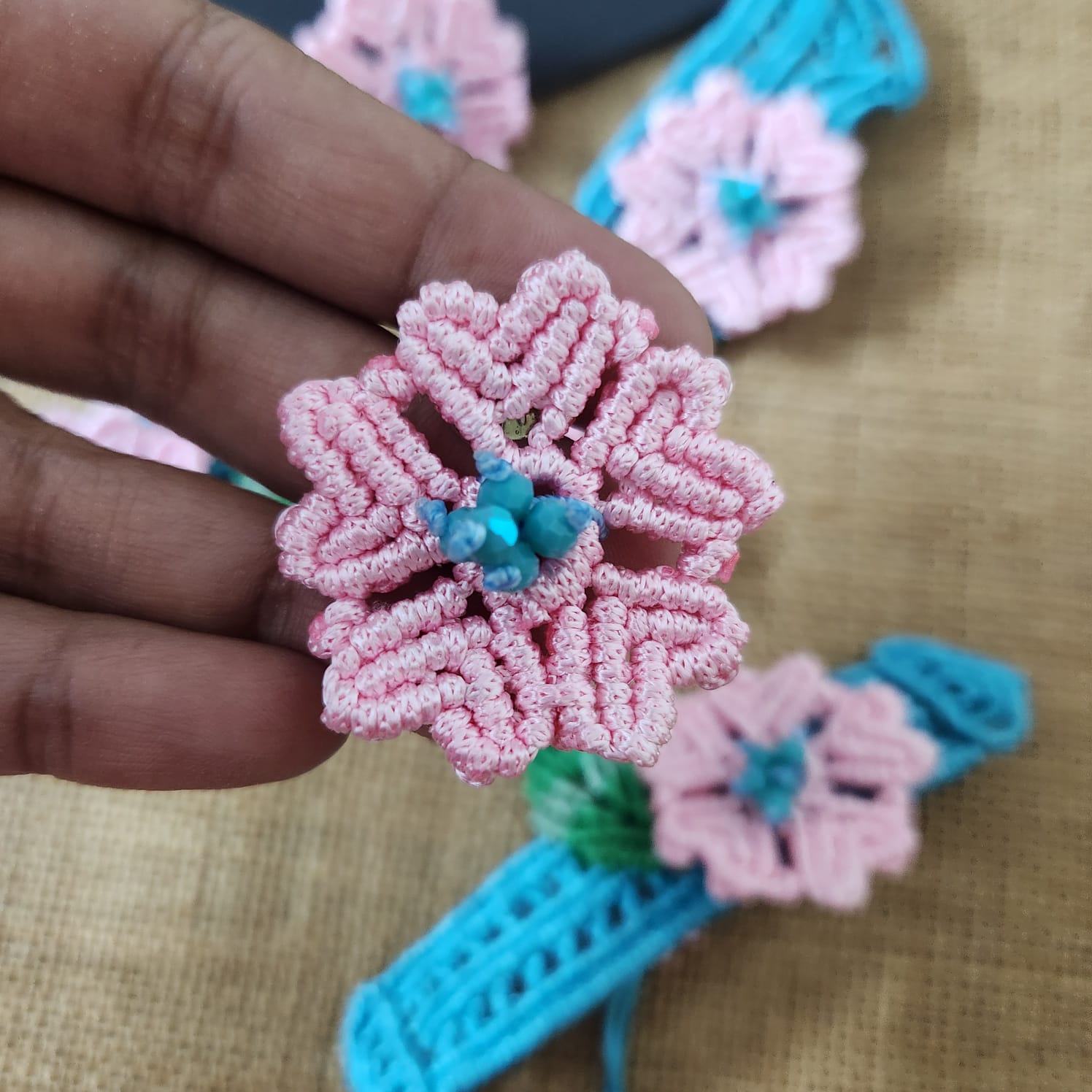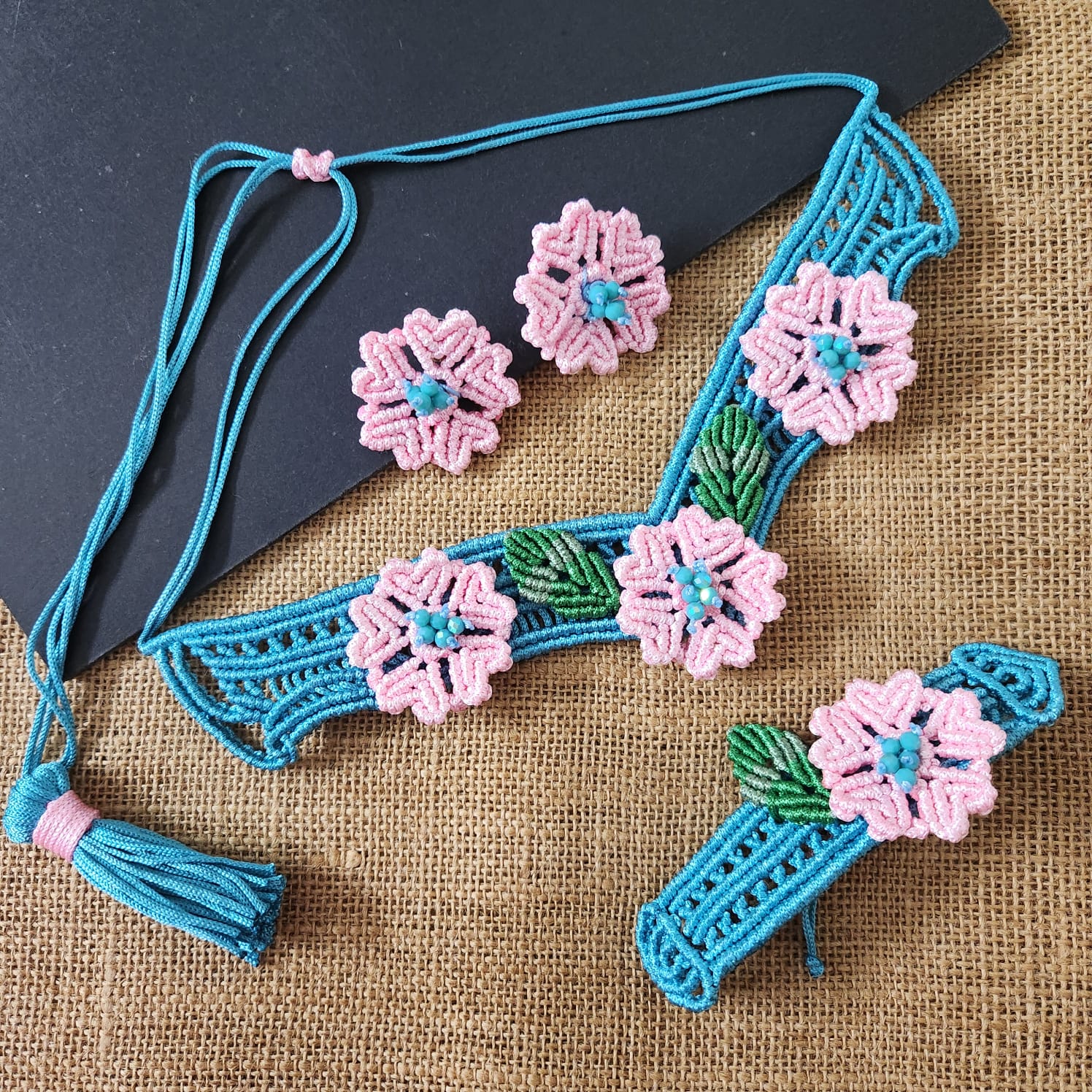 Made with blue and baby pink yarn and glass and crystal beads, this loose choker necklace showcases intricate macrame techniques. Blue yarn is used to create the framework on which the flowers are set. The flowers are made individually by first creating the petals and joining them seamlessly. Each flower center has small turquoise faceted beads. Leaves are created in green. The earrings are single flowers as studs. The bracelet has one flower and leaf offset on the center. The set is lightweight and comfortable to wear and is metal free (except for the stud back and posts). This provides it incredible durability and minimum maintenance needs.