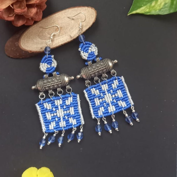 These bead earrings took a longer time to create than most. I worked on them in three stages. First was to make the top spiral round portion in peacock blue and silver yarn (blue, rust brown, or black with silver as well). Then I designed and created the bottom floral part using the cavandoli technique in macrame. This technique uses only 1 macrame knot but is very precise and involves counting stitches/knots to create the pattern. If you look closely, the pattern matches the one on the silver rod, the eight petalled flower.