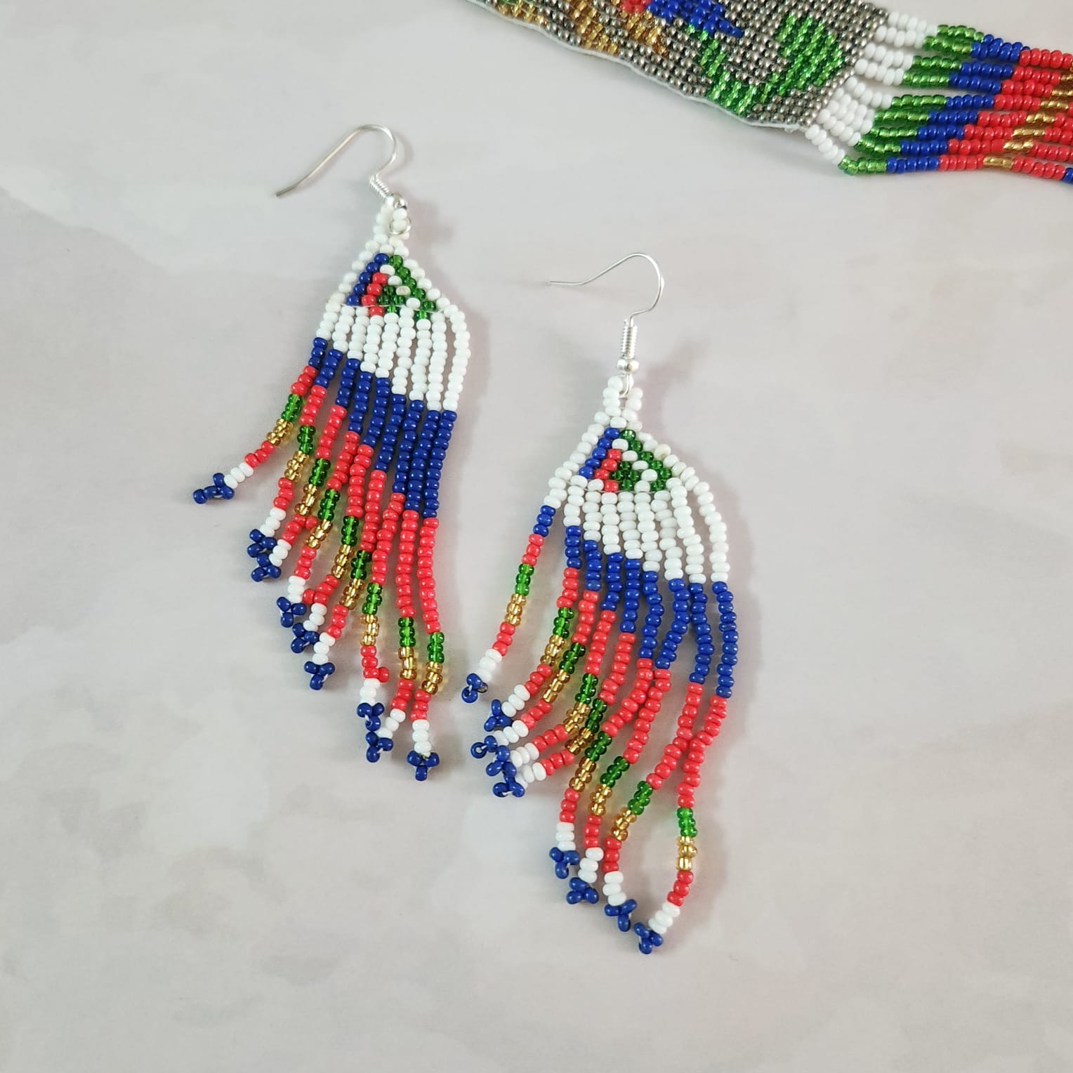 A spectacular creation with 15/0 seed beads in peacock colours and white. The pendant part features a beautiful peacock with the fringe cleverly created to being its tail feathers. Each row of beads is worked from a chart and has to be absolutely accurate to achieve the perfect design.Β
