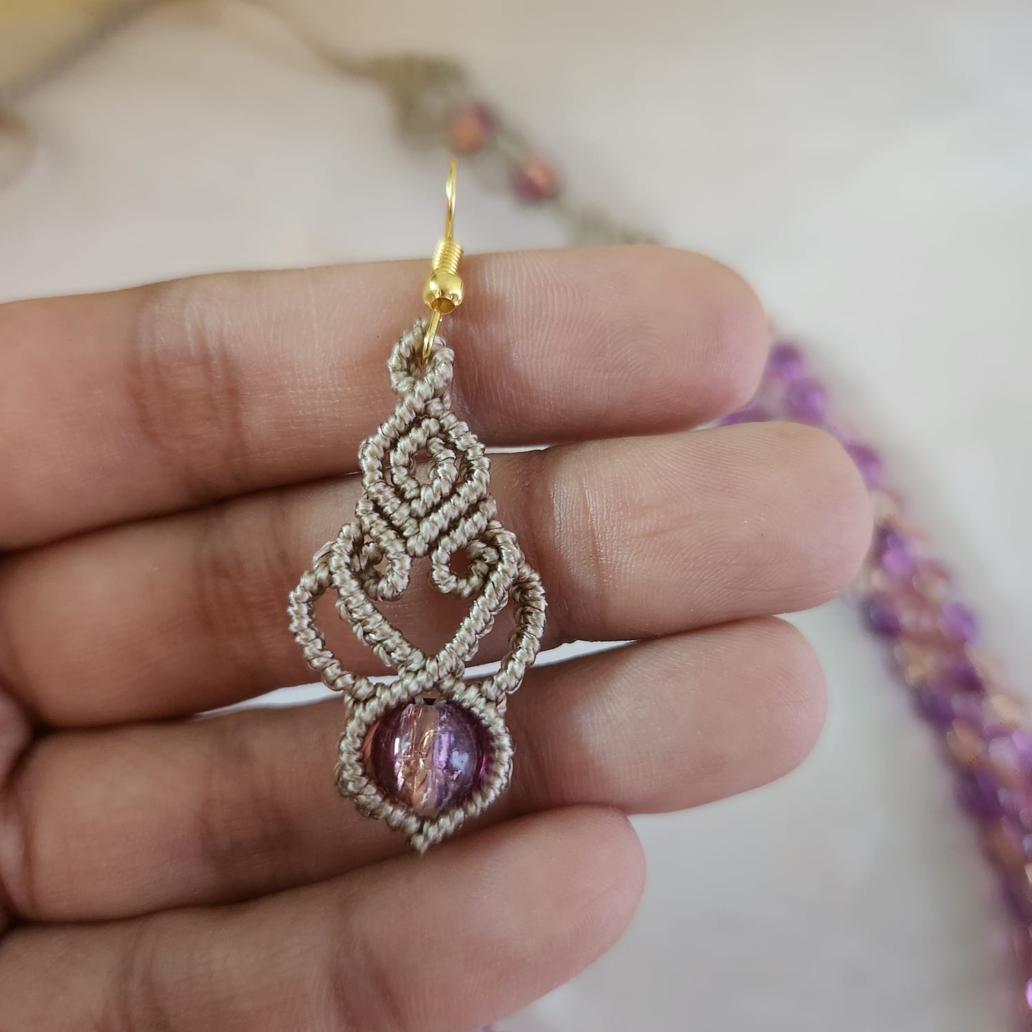 A delicate necklace with macrame designs on both sides and two layers of glass beads.