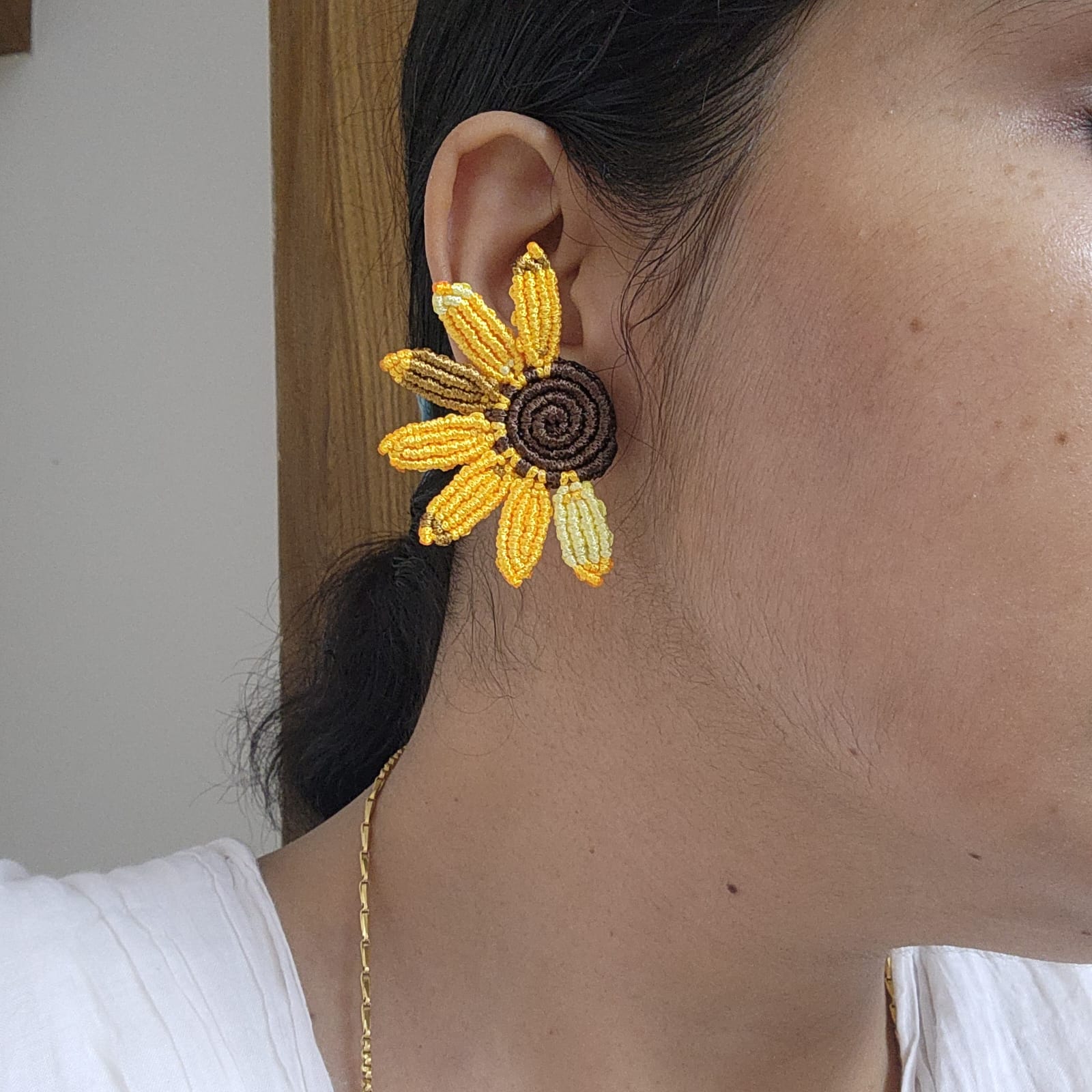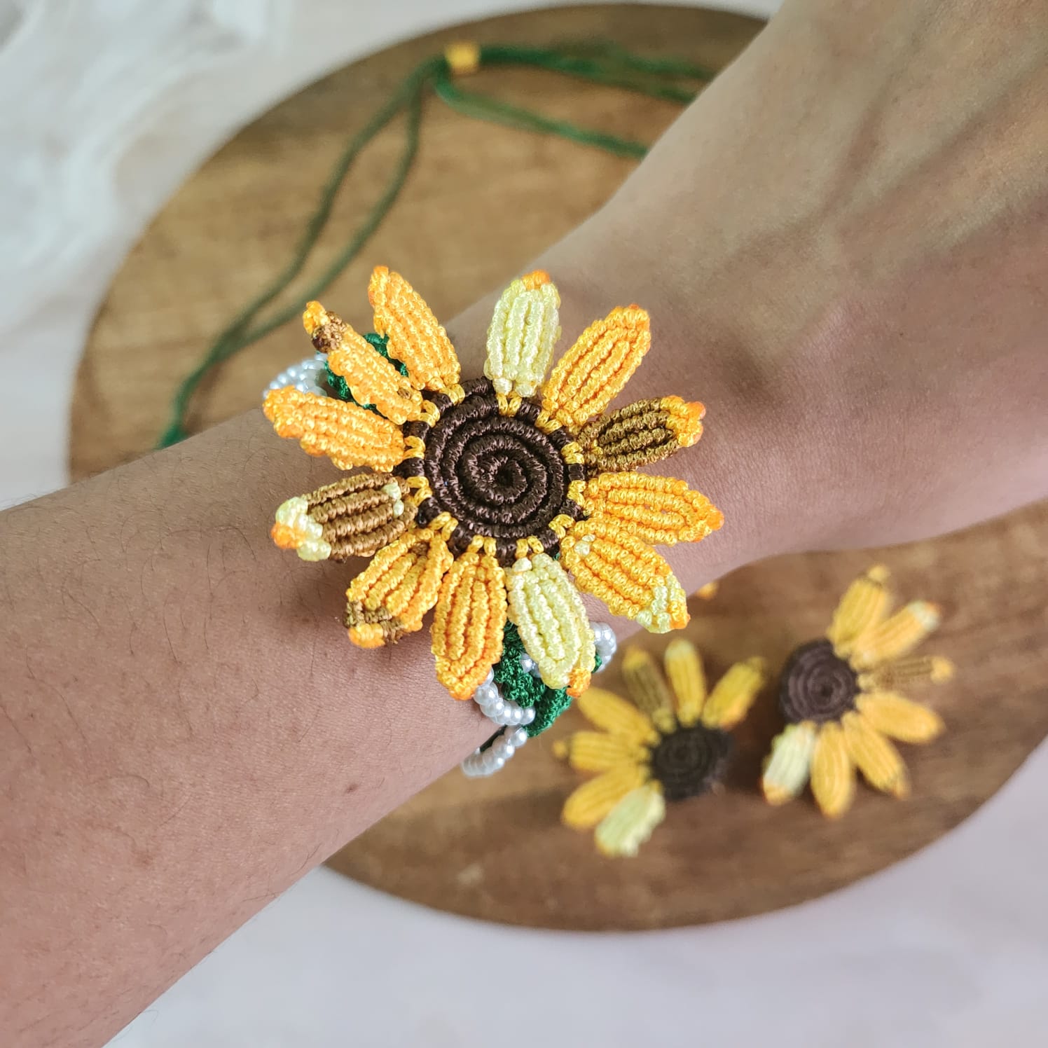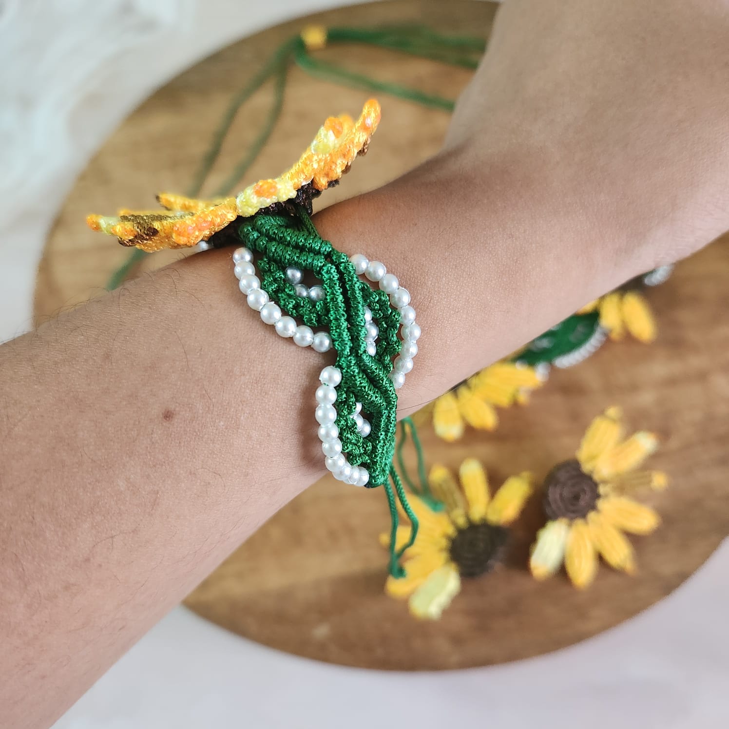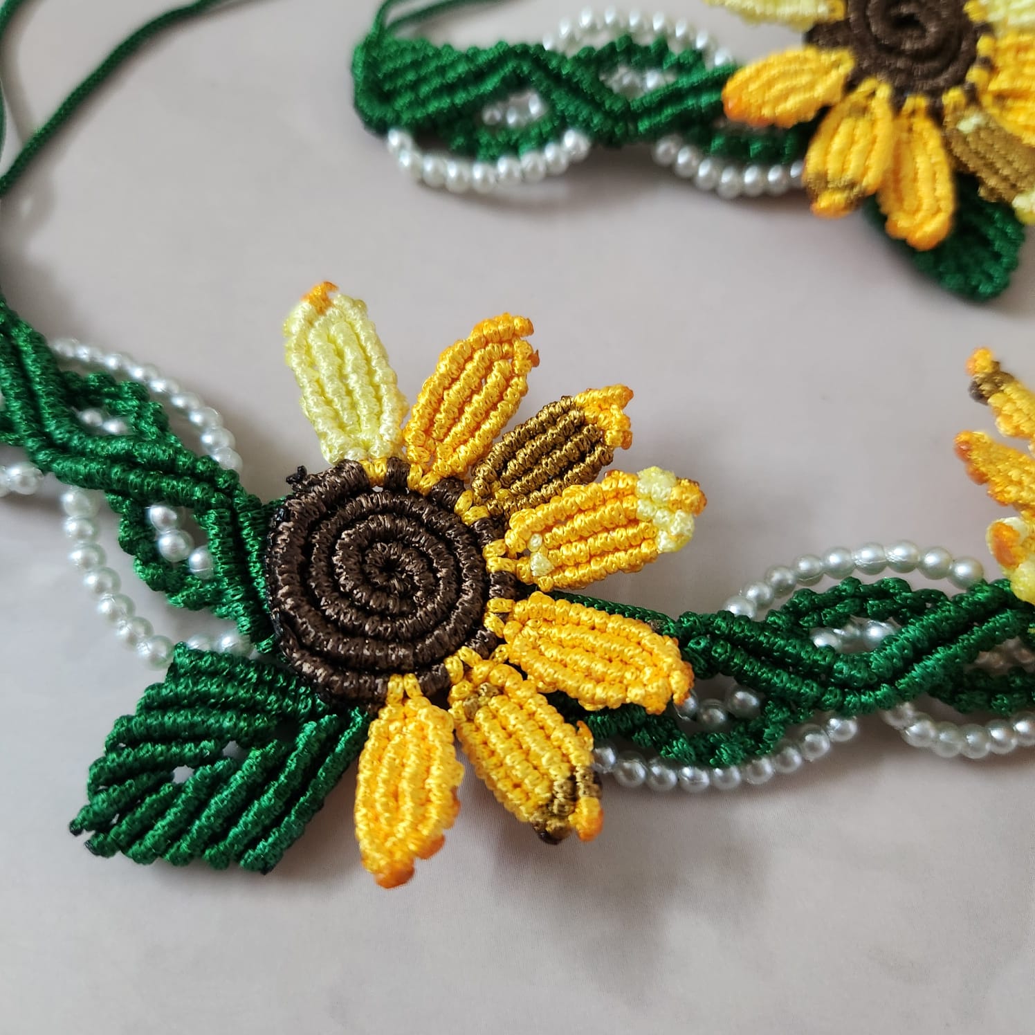 Made with 1mm nylon polyester yarn in beautiful yellows and green colours, this necklace set feature full and half sunflower blooms and leaves in a choker necklace, earrings and bracelet.