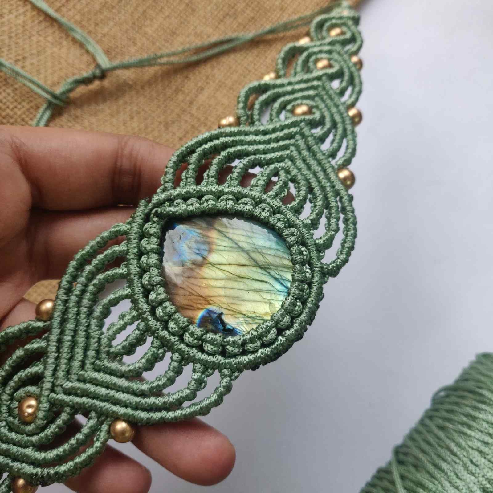 This stunning choker necklace set features a flashing semiprecious labrodorite in the center with delicate macrame work. The cream colour of the thread contrasts perfectly with the stone and is accented further by the antique gold beads.