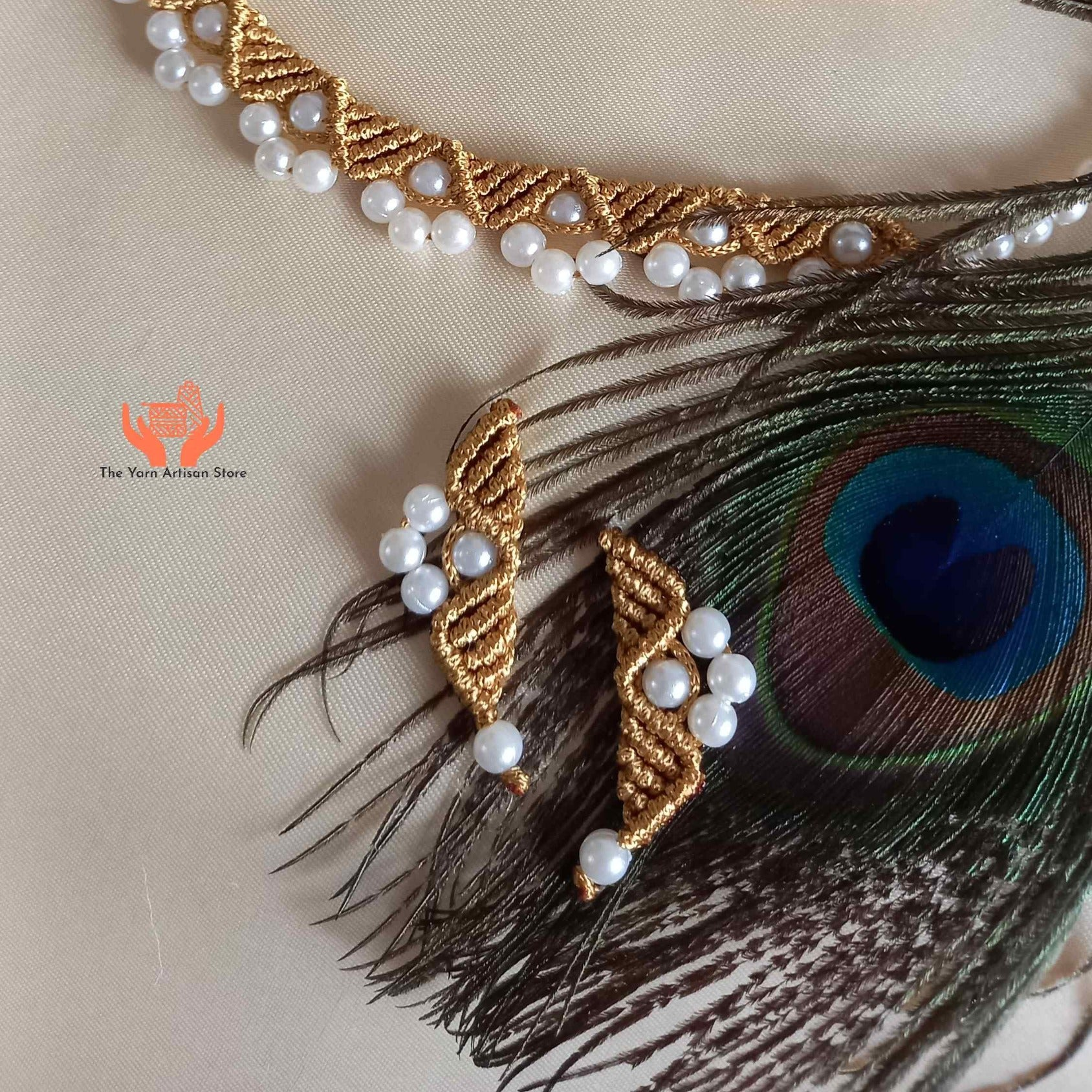 This set is made with antique gold yarn and pearl beads and follows a pretty zigzag pattern. There is a matching bracelet and stud earrings to go with the necklace.